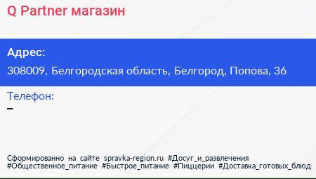 Q Partner, магазин по адресу 308009, Белгородская область, Белгород, Попова, 36 в дальнейшем Организация, размещена в следующих категориях: