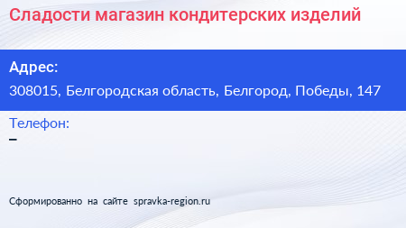 Сладости, магазин кондитерских изделий по адресу 308015, Белгородская область, Белгород, Победы, 147 в дальнейшем Организация, размещена в следующих категориях: