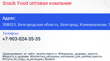 Snaсk Food, оптовая компания по адресу 308013, Белгородская область, Белгород, Коммунальная, 5 в дальнейшем Организация, размещена в следующих категориях: