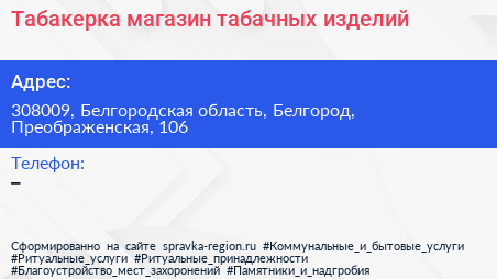 Табакерка, магазин табачных изделий по адресу 308009, Белгородская область, Белгород, Преображенская, 106 в дальнейшем Организация, размещена в следующих категориях: