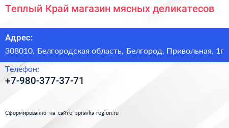 Теплый Край, магазин мясных деликатесов по адресу 308010, Белгородская область, Белгород, Привольная, 1г в дальнейшем Организация, размещена в следующих категориях:
