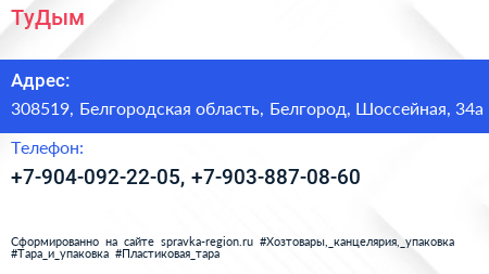 ТуДым по адресу 308519, Белгородская область, Белгород, Шоссейная, 34а в дальнейшем Организация, размещена в следующих категориях: