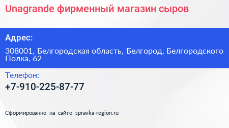 Unagrande, фирменный магазин сыров по адресу 308001, Белгородская область, Белгород, Белгородского Полка, 62 в дальнейшем Организация, размещена в следующих категориях: