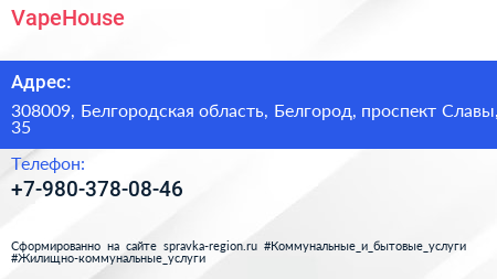 VapeHouse по адресу 308009, Белгородская область, Белгород, проспект Славы, 35 в дальнейшем Организация, размещена в следующих категориях: