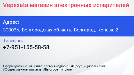 Vapexata, магазин электронных испарителей по адресу 308036, Белгородская область, Белгород, Конева, 2 в дальнейшем Организация, размещена в следующих категориях: