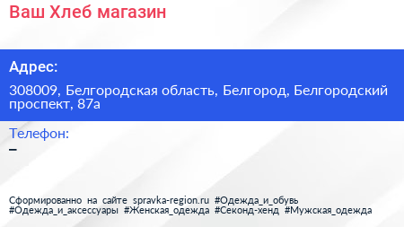 Ваш Хлеб, магазин по адресу 308009, Белгородская область, Белгород, Белгородский проспект, 87а в дальнейшем Организация, размещена в следующих категориях: