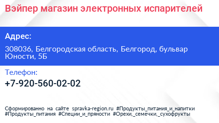 Вэйпер, магазин электронных испарителей по адресу 308036, Белгородская область, Белгород, бульвар Юности, 5Б в дальнейшем Организация, размещена в следующих категориях:
