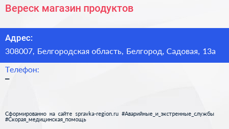 Вереск, магазин продуктов по адресу 308007, Белгородская область, Белгород, Садовая, 13а в дальнейшем Организация, размещена в следующих категориях: