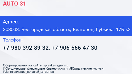AUTO 31 по адресу 308033, Белгородская область, Белгород, Губкина, 17Б к2 в дальнейшем Организация, размещена в следующих категориях: