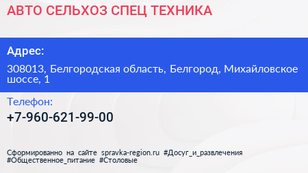 АВТО-СЕЛЬХОЗ СПЕЦ ТЕХНИКА по адресу 308013, Белгородская область, Белгород, Михайловское шоссе, 1 в дальнейшем Организация, размещена в следующих категориях: