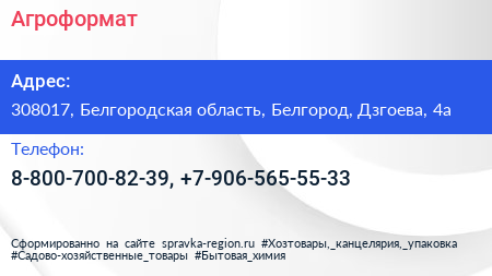 Агроформат по адресу 308017, Белгородская область, Белгород, Дзгоева, 4а в дальнейшем Организация, размещена в следующих категориях: