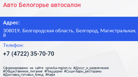 Авто-Белогорье, автосалон по адресу 308019, Белгородская область, Белгород, Магистральная, 8 в дальнейшем Организация, размещена в следующих категориях:
