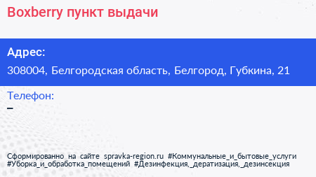 Boxberry, пункт выдачи по адресу 308004, Белгородская область, Белгород, Губкина, 21 в дальнейшем Организация, размещена в следующих категориях:
