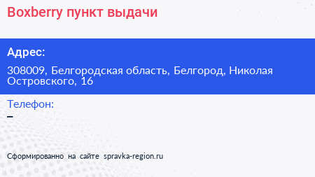 Boxberry, пункт выдачи по адресу 308009, Белгородская область, Белгород, Николая Островского, 16 в дальнейшем Организация, размещена в следующих категориях: