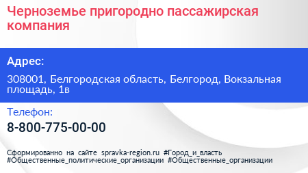 Черноземье, пригородно-пассажирская компания по адресу 308001, Белгородская область, Белгород, Вокзальная площадь, 1в в дальнейшем Организация, размещена в следующих категориях: