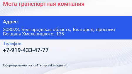 Мега, транспортная компания по адресу 308023, Белгородская область, Белгород, проспект Богдана Хмельницкого, 135 в дальнейшем Организация, размещена в следующих категориях: