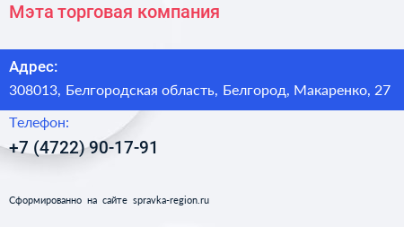 Мэта, торговая компания по адресу 308013, Белгородская область, Белгород, Макаренко, 27 в дальнейшем Организация, размещена в следующих категориях: