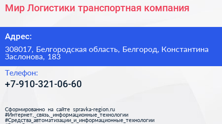 Мир Логистики, транспортная компания по адресу 308017, Белгородская область, Белгород, Константина Заслонова, 183 в дальнейшем Организация, размещена в следующих категориях: