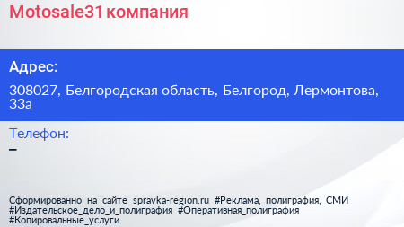 Motosale31, компания по адресу 308027, Белгородская область, Белгород, Лермонтова, 33а в дальнейшем Организация, размещена в следующих категориях: