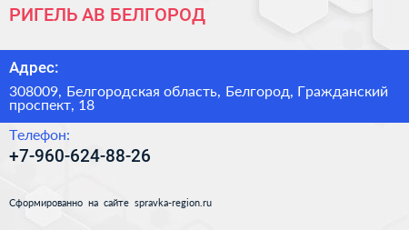 РИГЕЛЬ АВ-БЕЛГОРОД по адресу 308009, Белгородская область, Белгород, Гражданский проспект, 18 в дальнейшем Организация, размещена в следующих категориях: