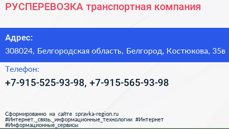 РУСПЕРЕВОЗКА, транспортная компания по адресу 308024, Белгородская область, Белгород, Костюкова, 35в в дальнейшем Организация, размещена в следующих категориях:
