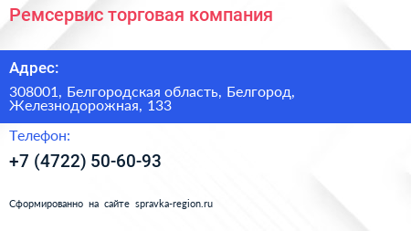 Ремсервис, торговая компания по адресу 308001, Белгородская область, Белгород, Железнодорожная, 133 в дальнейшем Организация, размещена в следующих категориях: