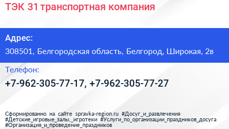 ТЭК-31, транспортная компания по адресу 308501, Белгородская область, Белгород, Широкая, 2в в дальнейшем Организация, размещена в следующих категориях: