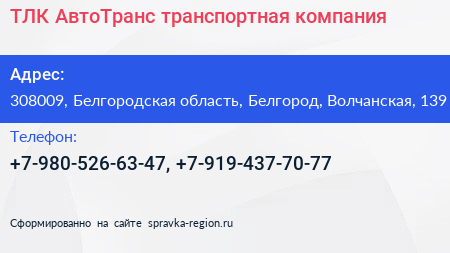 ТЛК АвтоТранс, транспортная компания по адресу 308009, Белгородская область, Белгород, Волчанская, 139 в дальнейшем Организация, размещена в следующих категориях: