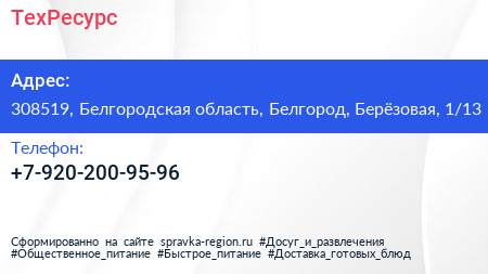 ТехРесурс по адресу 308519, Белгородская область, Белгород, Берёзовая, 1/13 в дальнейшем Организация, размещена в следующих категориях:
