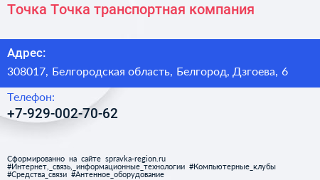 Точка-Точка, транспортная компания по адресу 308017, Белгородская область, Белгород, Дзгоева, 6 в дальнейшем Организация, размещена в следующих категориях: