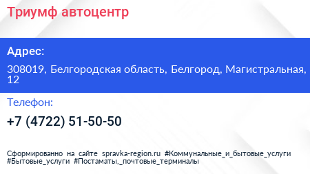 Триумф, автоцентр по адресу 308019, Белгородская область, Белгород, Магистральная, 12 в дальнейшем Организация, размещена в следующих категориях: