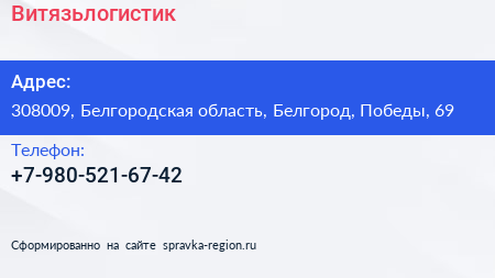 Витязьлогистик по адресу 308009, Белгородская область, Белгород, Победы, 69 в дальнейшем Организация, размещена в следующих категориях: