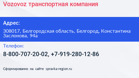 Vozovoz, транспортная компания по адресу 308017, Белгородская область, Белгород, Константина Заслонова, 94а в дальнейшем Организация, размещена в следующих категориях: