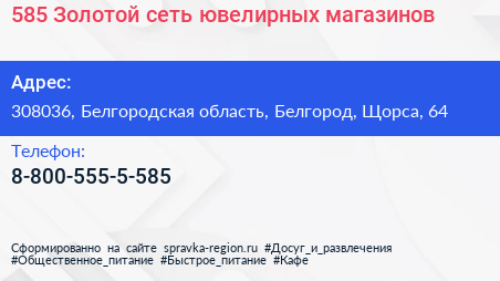 585 Золотой, сеть ювелирных магазинов по адресу 308036, Белгородская область, Белгород, Щорса, 64 в дальнейшем Организация, размещена в следующих категориях: