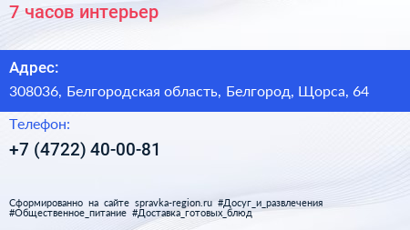 7 часов интерьер по адресу 308036, Белгородская область, Белгород, Щорса, 64 в дальнейшем Организация, размещена в следующих категориях: