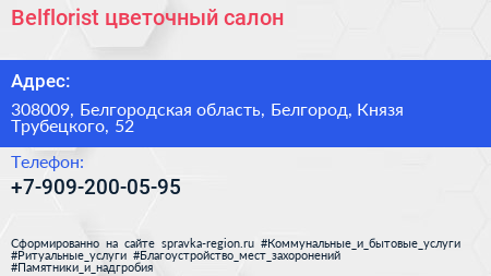 Belflorist, цветочный салон по адресу 308009, Белгородская область, Белгород, Князя Трубецкого, 52 в дальнейшем Организация, размещена в следующих категориях: