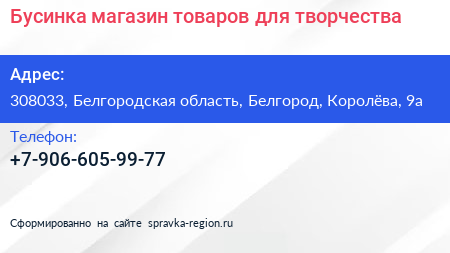 Бусинка, магазин товаров для творчества по адресу 308033, Белгородская область, Белгород, Королёва, 9а в дальнейшем Организация, размещена в следующих категориях: