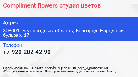 Compliment flowers, студия цветов по адресу 308001, Белгородская область, Белгород, Народный бульвар, 17 в дальнейшем Организация, размещена в следующих категориях: