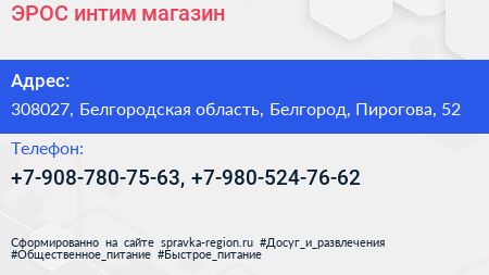 ЭРОС, интим-магазин по адресу 308027, Белгородская область, Белгород, Пирогова, 52 в дальнейшем Организация, размещена в следующих категориях: