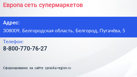 Европа, сеть супермаркетов по адресу 308009, Белгородская область, Белгород, Пугачёва, 5 в дальнейшем Организация, размещена в следующих категориях: