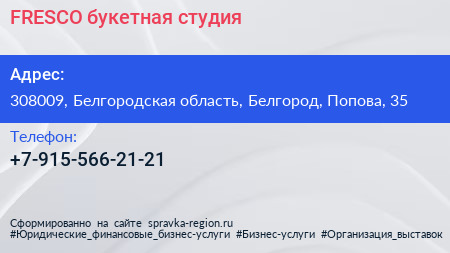 FRESCO, букетная студия по адресу 308009, Белгородская область, Белгород, Попова, 35 в дальнейшем Организация, размещена в следующих категориях: