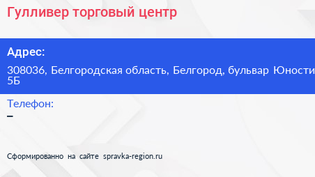 Гулливер, торговый центр по адресу 308036, Белгородская область, Белгород, бульвар Юности, 5Б в дальнейшем Организация, размещена в следующих категориях: