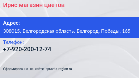 Ирис, магазин цветов по адресу 308015, Белгородская область, Белгород, Победы, 165 в дальнейшем Организация, размещена в следующих категориях: