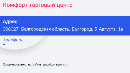 Комфорт, торговый центр по адресу 308027, Белгородская область, Белгород, 5 Августа, 1а в дальнейшем Организация, размещена в следующих категориях: