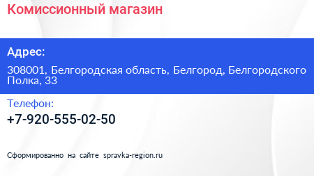 Комиссионный магазин по адресу 308001, Белгородская область, Белгород, Белгородского Полка, 33 в дальнейшем Организация, размещена в следующих категориях: