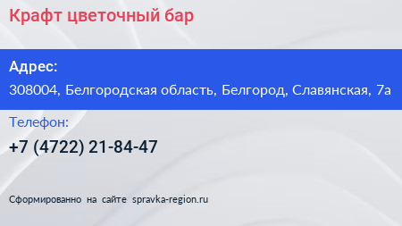 Крафт, цветочный бар по адресу 308004, Белгородская область, Белгород, Славянская, 7а в дальнейшем Организация, размещена в следующих категориях: