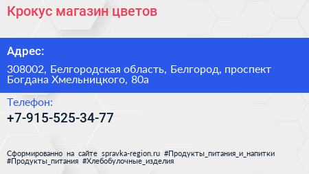 Крокус, магазин цветов по адресу 308002, Белгородская область, Белгород, проспект Богдана Хмельницкого, 80а в дальнейшем Организация, размещена в следующих категориях: