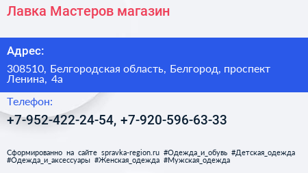 Лавка Мастеров, магазин по адресу 308510, Белгородская область, Белгород, проспект Ленина, 4а в дальнейшем Организация, размещена в следующих категориях: