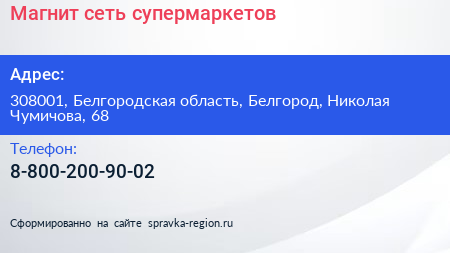 Магнит, сеть супермаркетов по адресу 308001, Белгородская область, Белгород, Николая Чумичова, 68 в дальнейшем Организация, размещена в следующих категориях: