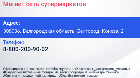 Магнит, сеть супермаркетов по адресу 308036, Белгородская область, Белгород, Конева, 2 в дальнейшем Организация, размещена в следующих категориях: